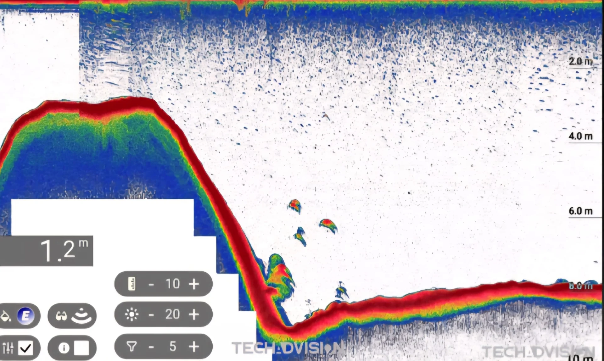 De sonar stuurt live data door naar je verbonden apparaat, zodat je in één oogopslag de bodemstructuur, diepte en visbewegingen kunt interpreteren. - Hoge Resolutie Beeldweergave